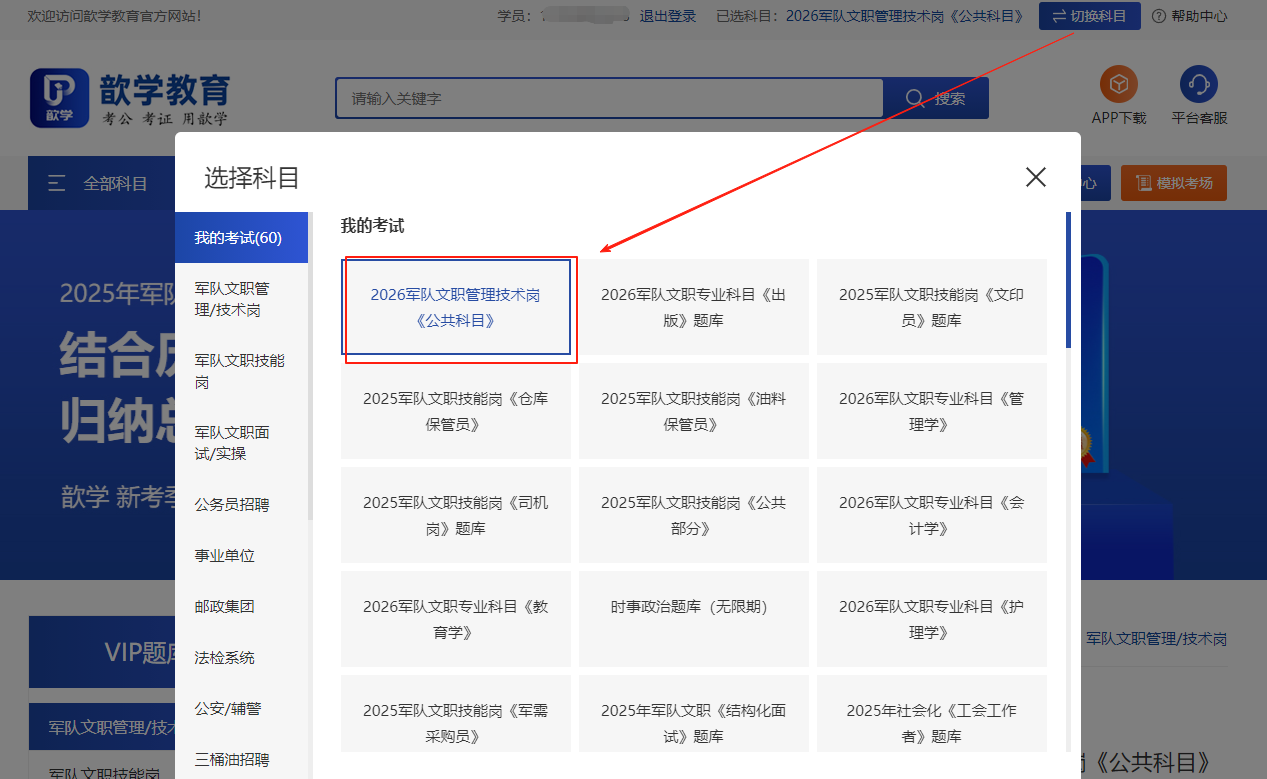 登录后,可以选择需要的科目,可以通过左边的科目列表,也可以通过顶部的切换科目: