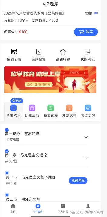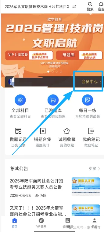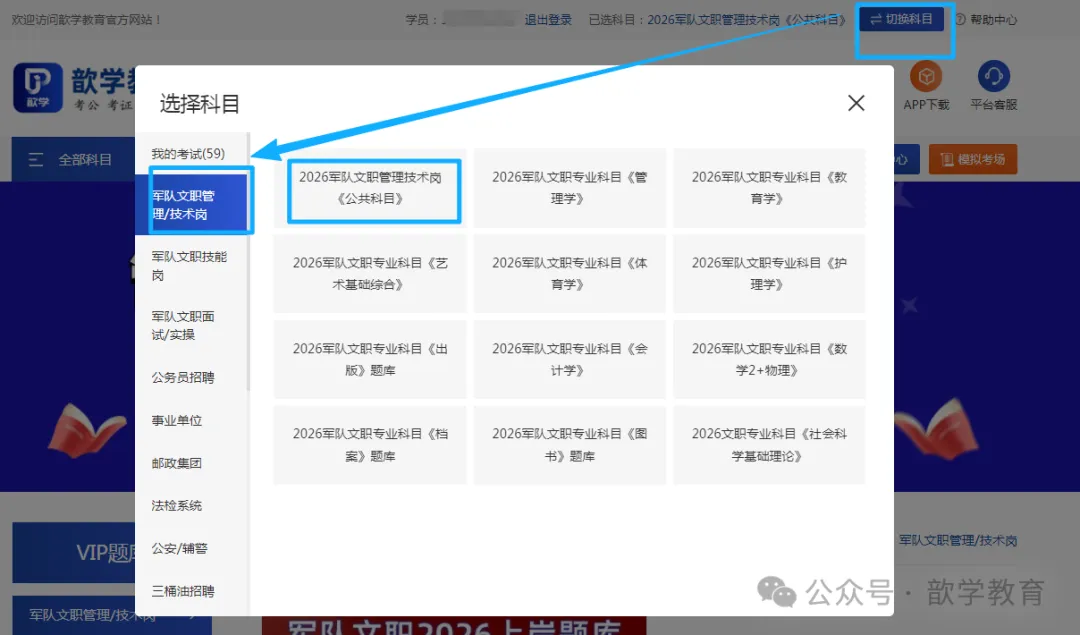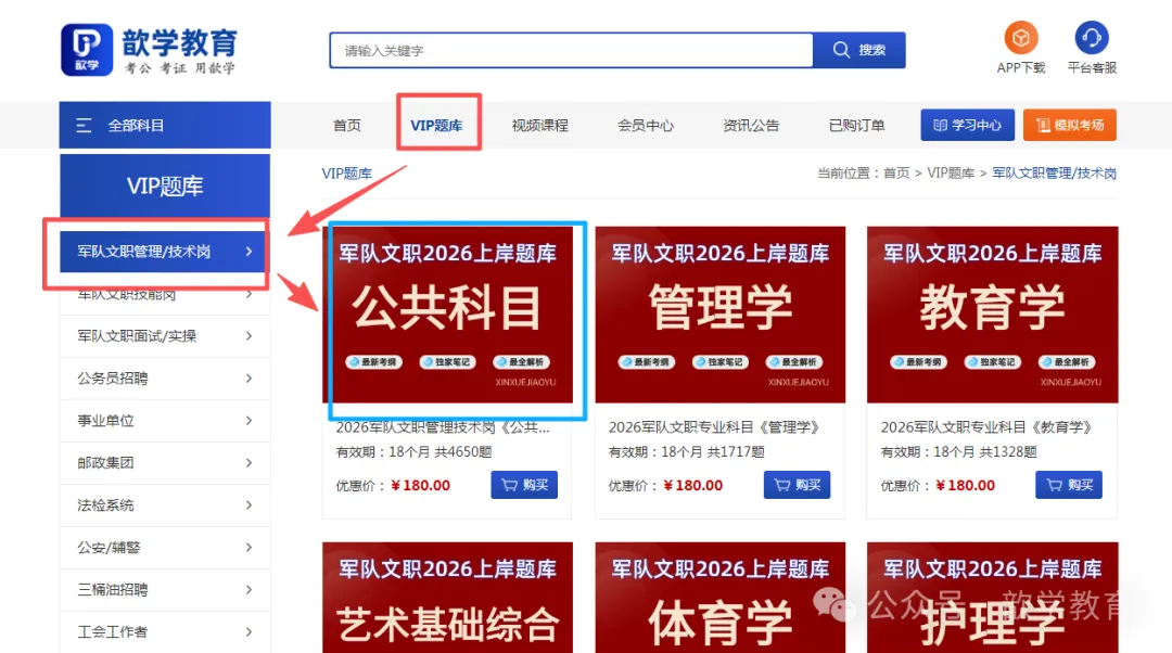 比如试看2026年军队文职管理技术岗的《公共科目》题库,可以在VIP题库中选择: