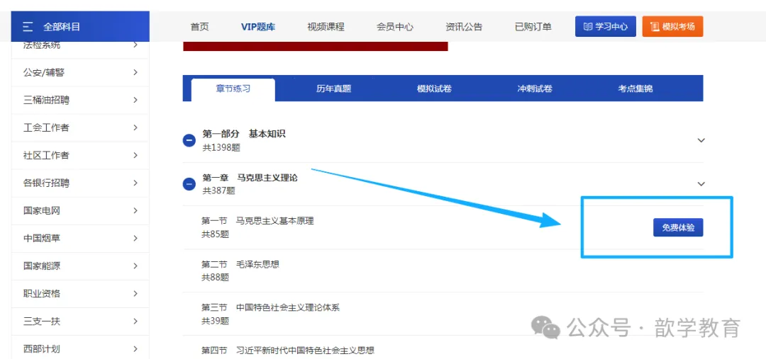 顶部切换想要试看的科目,点击后点开章节,显示“免费体验”的即可去试看: